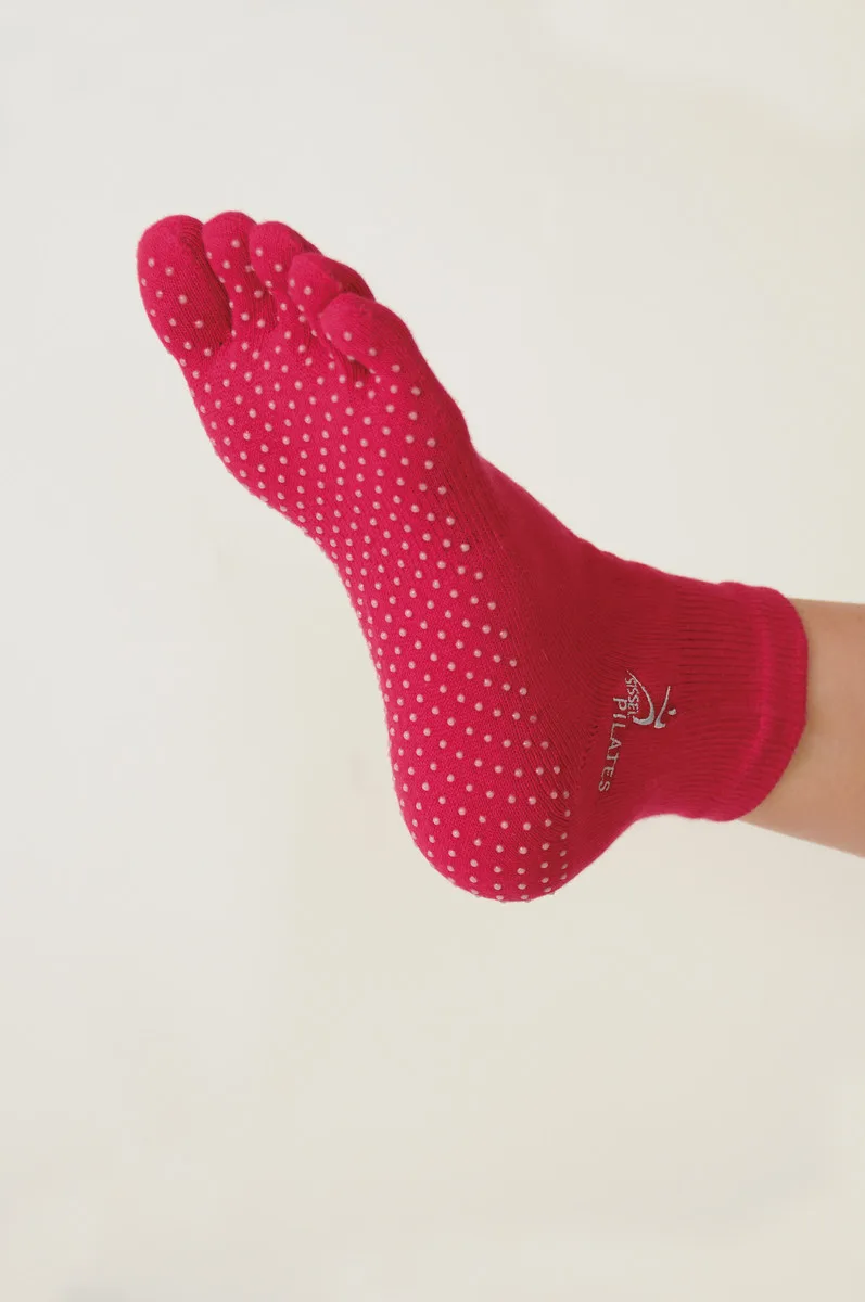 Toe socks with a non-slip sole pattern provide secure grip and support the foot’s natural movement during Pilates and yoga.